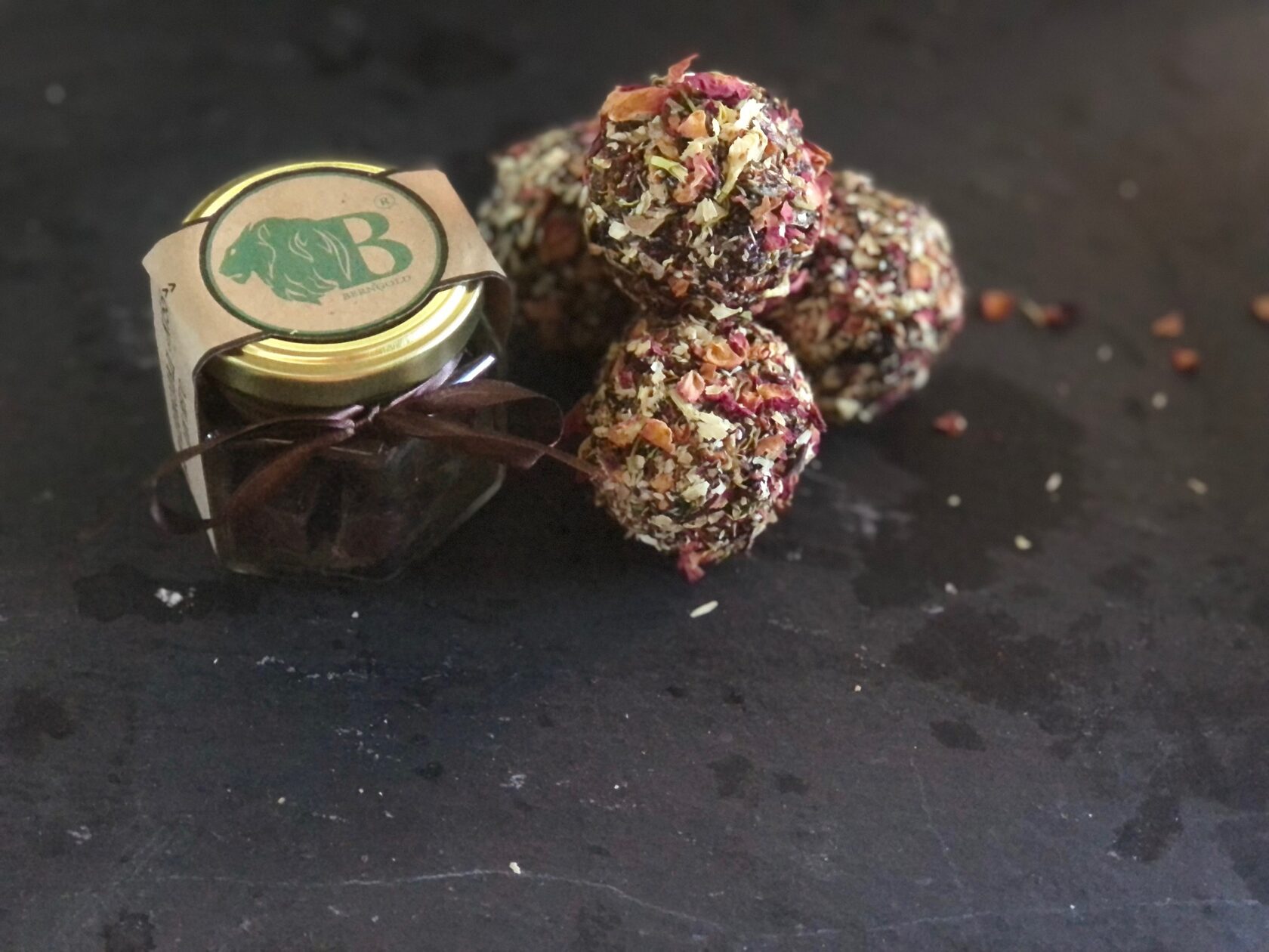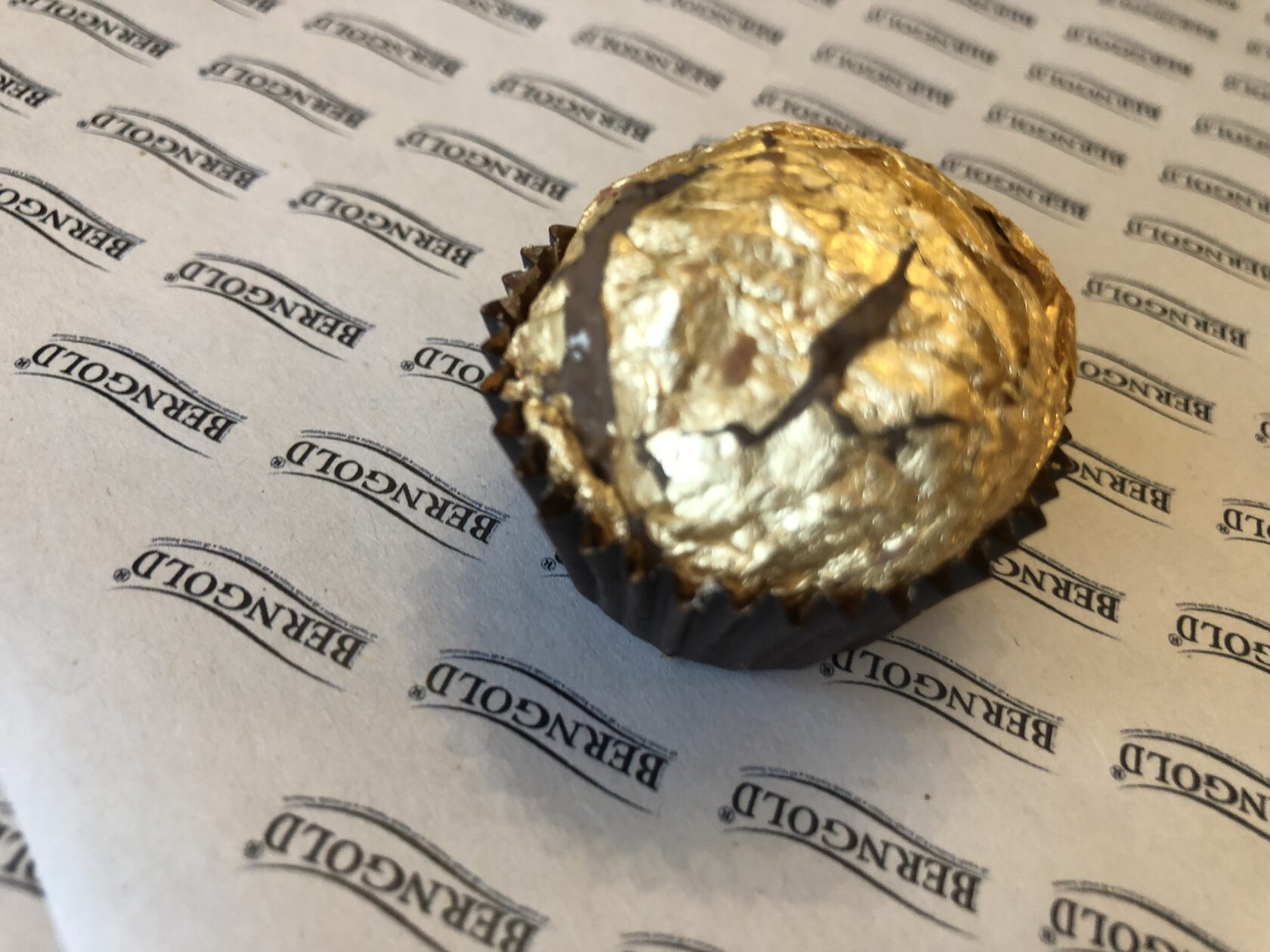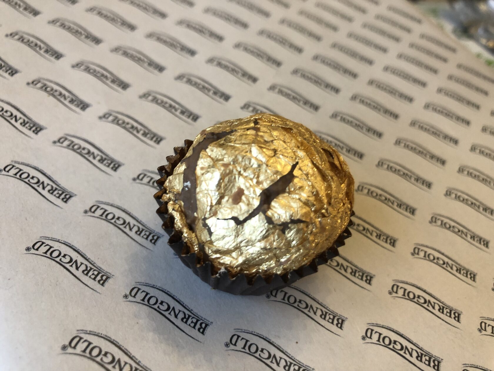 Конфеты круглой формы из молочного шоколада 35%. Содержит дробленные грецкие орехи и тонкие пластиночки из очищенных орехов миндаля (без кожуры). Конфеты покрыты 100% пищевым, сусальным золотом и серебром.